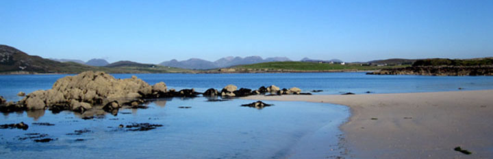 Above is Tra Bhride, at low tide, looking towards the back of Cleggan Bay, the Twelve Pins mountain range behind.