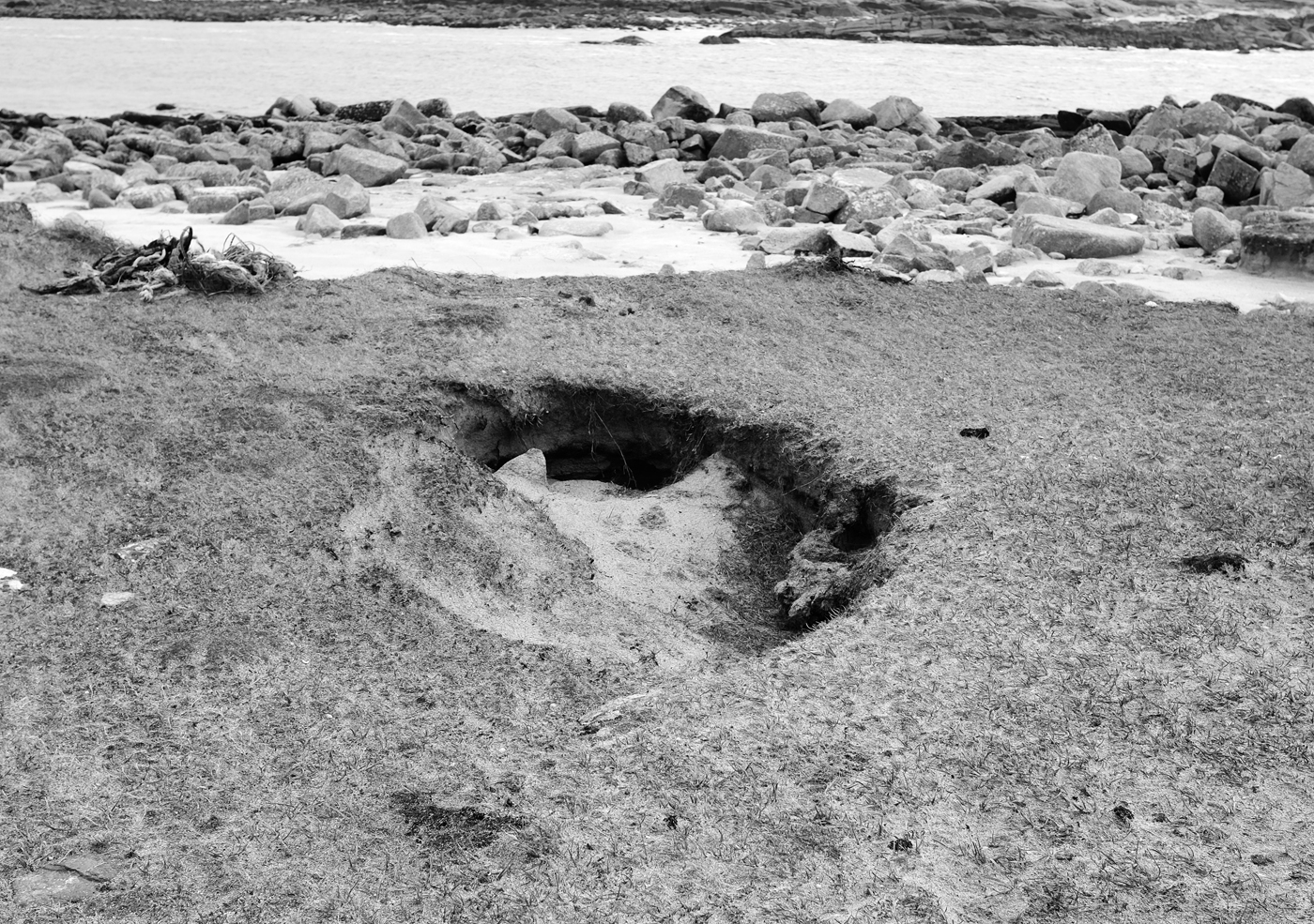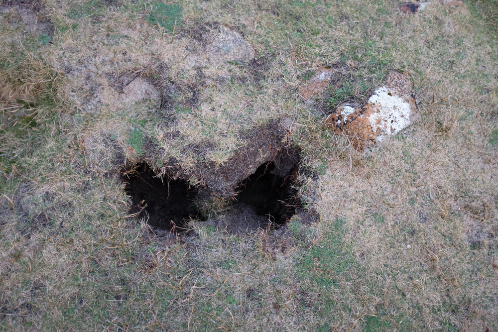 down the grass into areas that are slightly lower (see photo below), drains into the sub-soil, and forms underground streams which drain away beneath the grass, and out onto the coastal rocks, from holes that look just like rabbit holes (above and right).