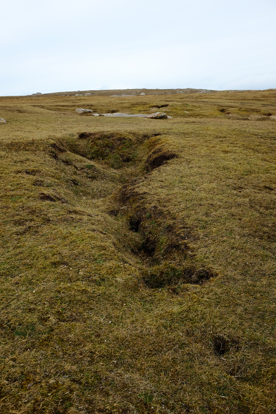 This process of erosion creates rows of parallel lines of collapsed land, sometimes 30-40 feet in length. So what's left are rows of promontories of grassland, with their edges exposed to erosion from both sides; and soon they're eaten into from both sides - and, at the coastal edge, by the sea.