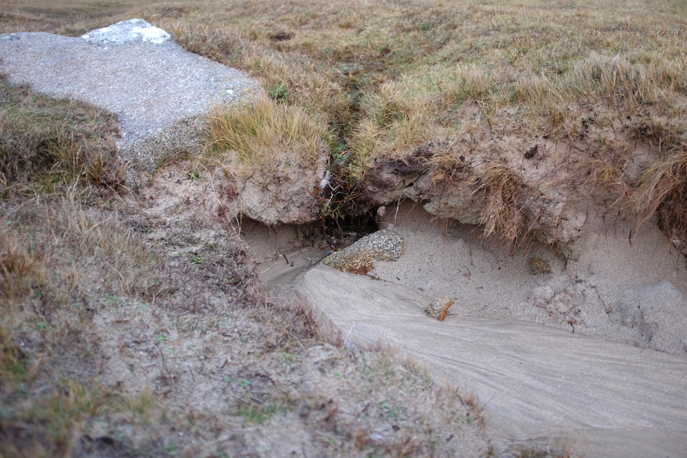 Maybe the worst form of erosion of all, though, comes from heavy rainfall onto coastal grassland with a sandy base. We seem to be seeing much more intense rain nowadays, making it hard for the land to cope. When there's a large volume of rain, it runs
