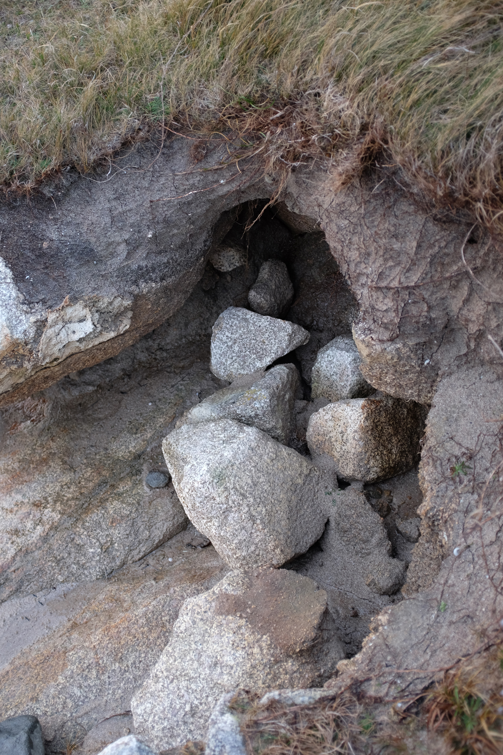 This is a really serious cause of erosion, erosion, but it's not the only mechanism, or even necessarily the worst - on Omey Island and other sandy parts of our coastline, anyway. It does eat away enormous chunks during strong wind and very high tides. And it leaves exposed low cliffs, as well as sand and rocks. where once there was grass: